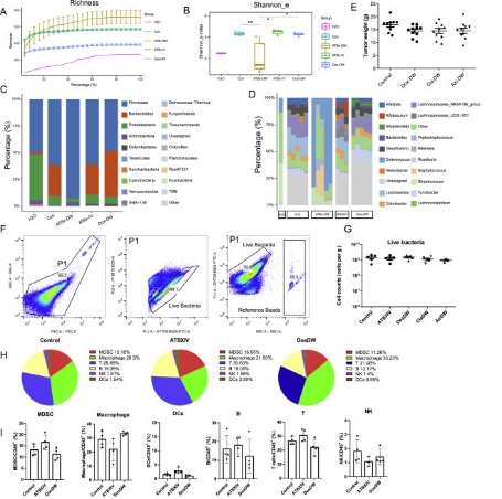 清除腫瘤內(nèi)的微生物會(huì)阻礙腫瘤的轉(zhuǎn)移,但不會(huì)阻礙原發(fā)腫瘤的生長(zhǎng)通過測(cè)試不同的抗生素組合和給藥途徑來選擇性地消除腫瘤駐留或腸道微生物群(圖3A)。研究發(fā)現(xiàn)使用雞尾酒抗生素(ATBx),通過飲用水(DW)可以有效清除腸道和腫瘤微生物菌群。當(dāng)ATBx經(jīng)尾靜脈靜脈注射時(shí),腫瘤菌群被清除,而腸道菌群保持完整(圖3B和3C)。通過DW給藥穿透細(xì)胞膜的抗生素多西環(huán)素具有與ATBx-IV相似的效果(圖3B和3C)。最重要的是,ATBx-IV和Dox-DW處理在腸道活菌數(shù)量、腸道微生物群譜和腫瘤免疫譜方面與對(duì)照組保持相當(dāng)(圖S3A S3D和S3F S3I)。結(jié)果發(fā)現(xiàn)ATBx-DW能有效地減緩自發(fā)MMTV-PyMT BTs的腫瘤生長(zhǎng)(總腫瘤重量為15±對(duì)照組為0.5g,而ATBx-DW為11±0.8g),而單獨(dú)用ATBx-IV或Dox-DW消除腫瘤微生物群并不影響腫瘤總重量(圖3D)。這表明腸道菌群在腫瘤生長(zhǎng)中起著重要作用,而腫瘤菌群則不然。