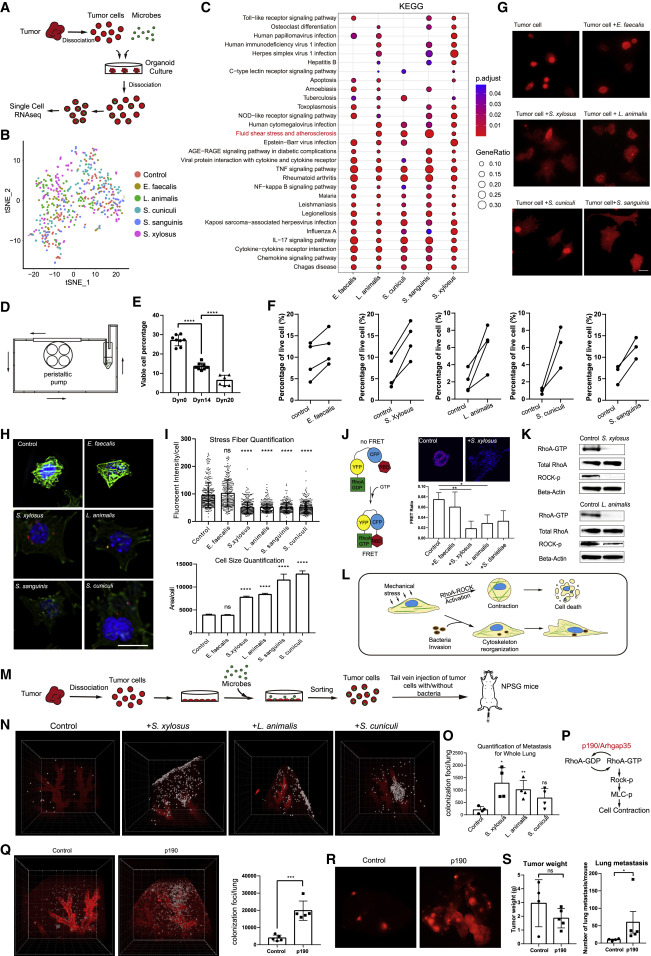 研究對(duì)從類器官培養(yǎng)中分離的細(xì)菌入侵癌細(xì)胞進(jìn)行單細(xì)胞RNAseq分析(圖6A)。 KEGG通路分析顯示,被細(xì)菌入侵的腫瘤細(xì)胞開啟了許多免疫相關(guān)信號(hào),包括toll樣受體信號(hào)通路、nod樣受體信號(hào)通路、TNF信號(hào)通路、NF-κB信號(hào)通路、Th17信號(hào)通路、細(xì)胞因子趨化因子相關(guān)通路等(圖6C)。有趣的是,研究發(fā)現(xiàn)木糖擬南芥、動(dòng)物擬南芥、兔丘擬南芥和馬血擬南芥對(duì)腫瘤細(xì)胞的侵襲特異性地觸發(fā)了流體剪切應(yīng)力途徑。