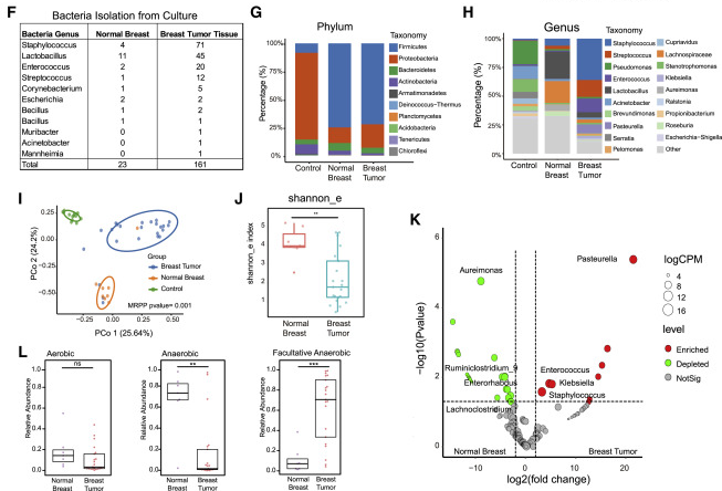 圖S1。在門和屬水平上優(yōu)化EBC對(duì)照組、正常乳腺和乳腺腫瘤組織常駐菌群分析及菌群相對(duì)豐度,與圖1和STAR方法相關(guān)
