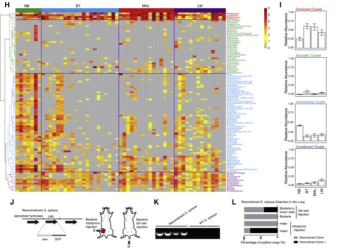 為了可視化腫瘤轉(zhuǎn)移過程中微生物群的動(dòng)態(tài)變化,研究人員繪制了不同樣本中不同細(xì)菌屬的豐度,以NB、BT、MAL、LM的順序作為腫瘤進(jìn)展的指示。有趣的是,無監(jiān)督聚類將細(xì)菌分為具有不同動(dòng)態(tài)模式的四類(圖4H和4I)。顯性聚類增加了乳腺組織中的豐度,微轉(zhuǎn)移持續(xù),大轉(zhuǎn)移減少(圖4H和4I)。